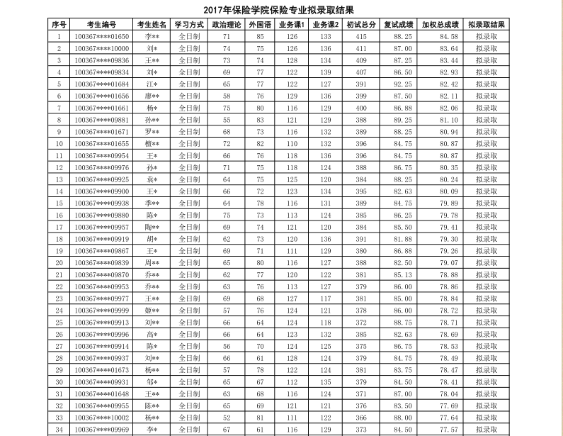 2017年对外经济贸易大学保险硕士研究生拟录取名单