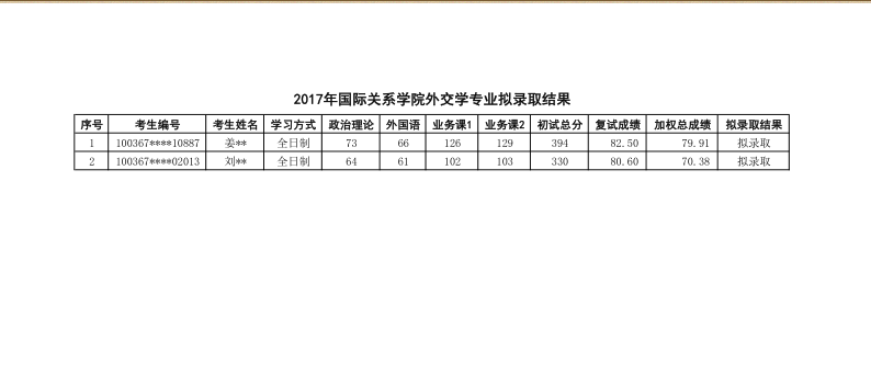 2017年对外经济贸易大学外交学研究生拟录取名单