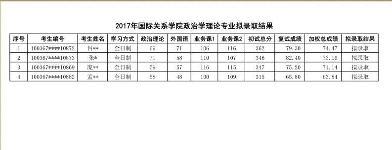 2017年对外经济贸易大学政治学理论研究生拟录取名单