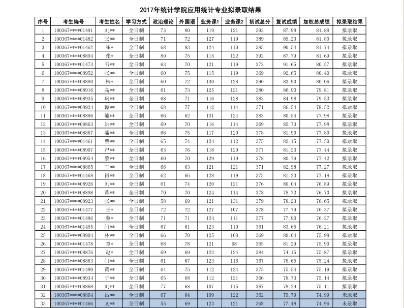 2017年对外经济贸易大学应用统计硕士研究生拟录取名单