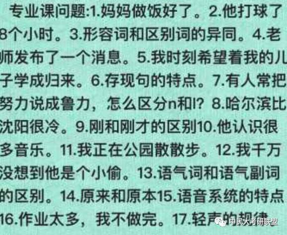 专业面试:从我上届就开始强调英语口语的重要性,结果很多人就忽视了专业课的复习,有些同学在复试的复习中根本就没把专业课当回事儿,这恰好成为了致命点。其实专业课特别是现汉和201例病句900例,在专业课面试当中特别有用。专业课好,回答问题的时候就能有底气,能更像一个老师的表达。有些跨专业的人老是担心自己专业课不够扎实,老师问的问题没回答好,就直接说,不好意思,我是跨专业的,这个知识点不熟练,之后会好好看。这样回答就显得特别业余……其实每一种题型都有回答的套路。比如说修改病句:1这个句子不对,®2这个句子错误的点是什么。®3这个句子中学生把A和B的用法弄混。®4.A应该用于什么,B应该用于什么。®5学生会犯这样的错误是因为母语负迁移(或者别的)®6应该在教学中这么改正®7由于时间关系,我暂时只能想到这么多,请老师批评指正。这样下来,就能撑够1分多钟了,老师就不会再揪着不放了。词语辨析也类似,但是要举例子,最好能举出正确的,也能举出错误的,再进行分析。概念题就没什么好说的,把课本上的答全就好了。我当时抽的是“区别词和形容词的不同”,直到答完了专业课,中间的主考老师才对我笑了(中间是刘院长)以下是今年考的一些题目,可以作为参考。