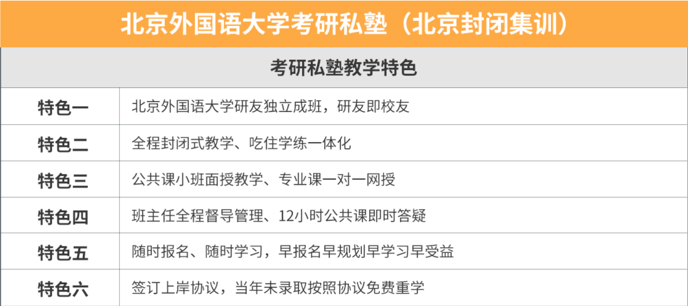 新祥旭考研机构开设有北京外国语大学考研私塾课程,北京外国语大学考研私塾为北外考研学子提供专属的封闭式集训学习环境,考研私塾全程封闭式教学、吃住学练一体化;公共课小班面授教学(PS:若公共课某科特别弱亦可单独再另咨一对一针对性补习)、专业课一对一面授或网授;班主任全程督导管理、公共课专业课即时免费答疑。考研学员随报随学,专业务实,真诚周到,助力上岸!