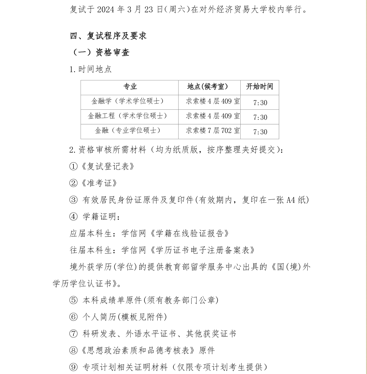 对外经济贸易大学中国金融学院2024年硕士研究生招生考试复试方案