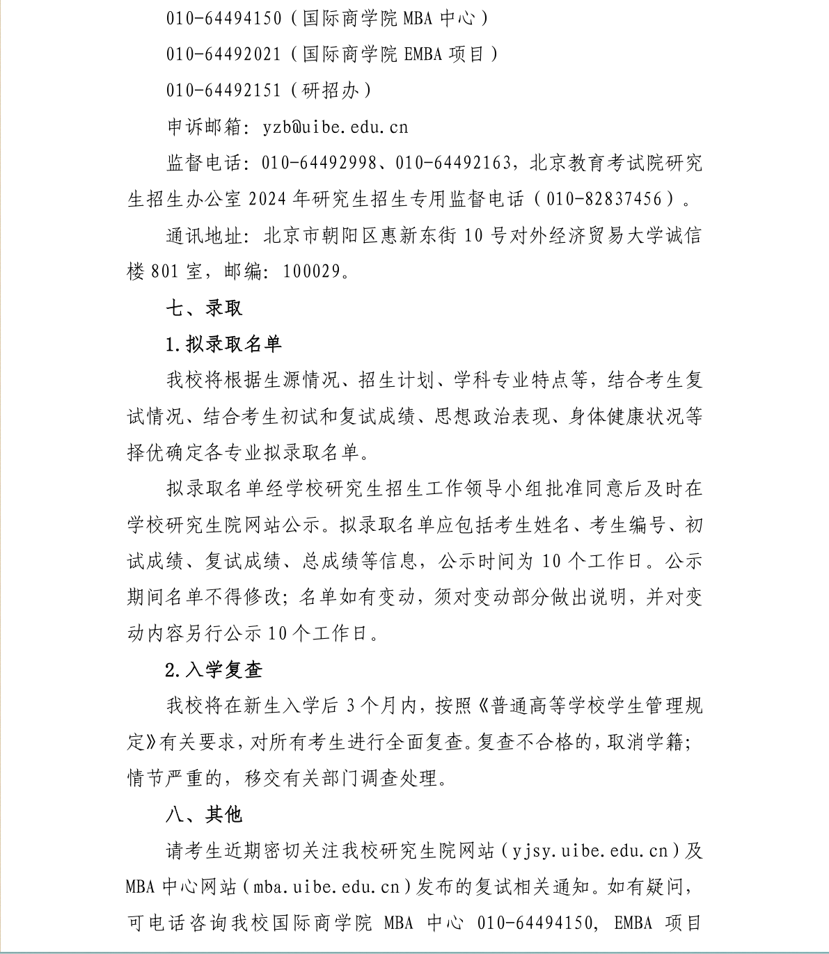对外经济贸易大学国际商学院工商管理硕士(MBA)2024年硕士研究生招生考试复试方案