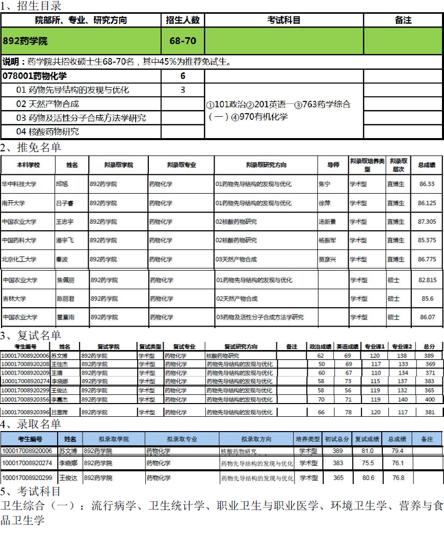 北京大学医学部078001 药物化学考研目录
