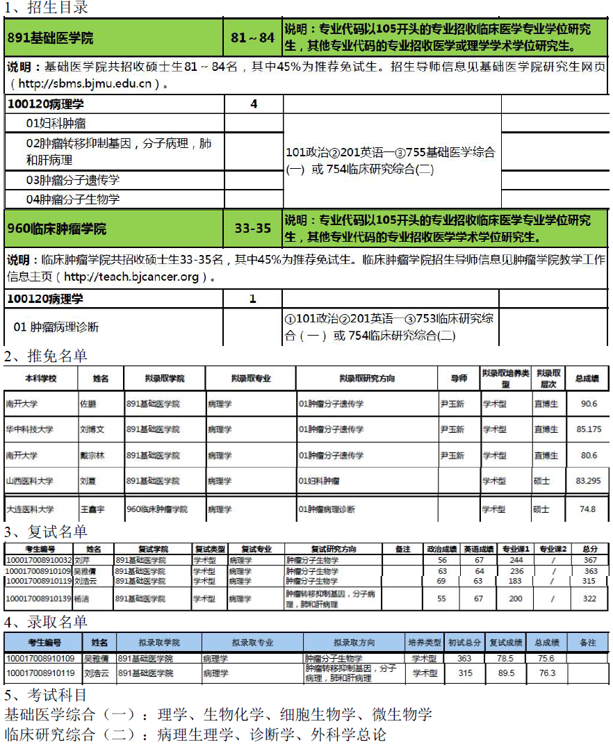 北京大学医学部100120病理学考研目录