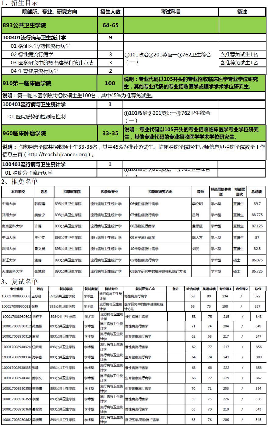北京大学医学部100401流行病与卫生统计学考研目录