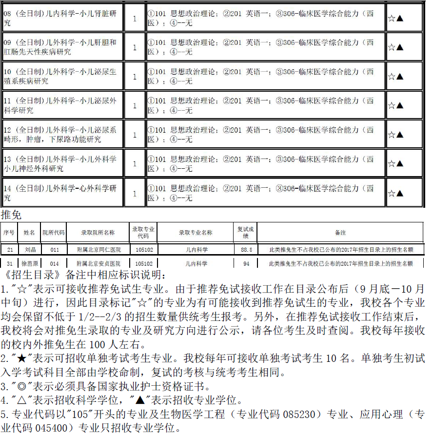 2017年首都医科大学105102儿科学招生目录、推免名单
