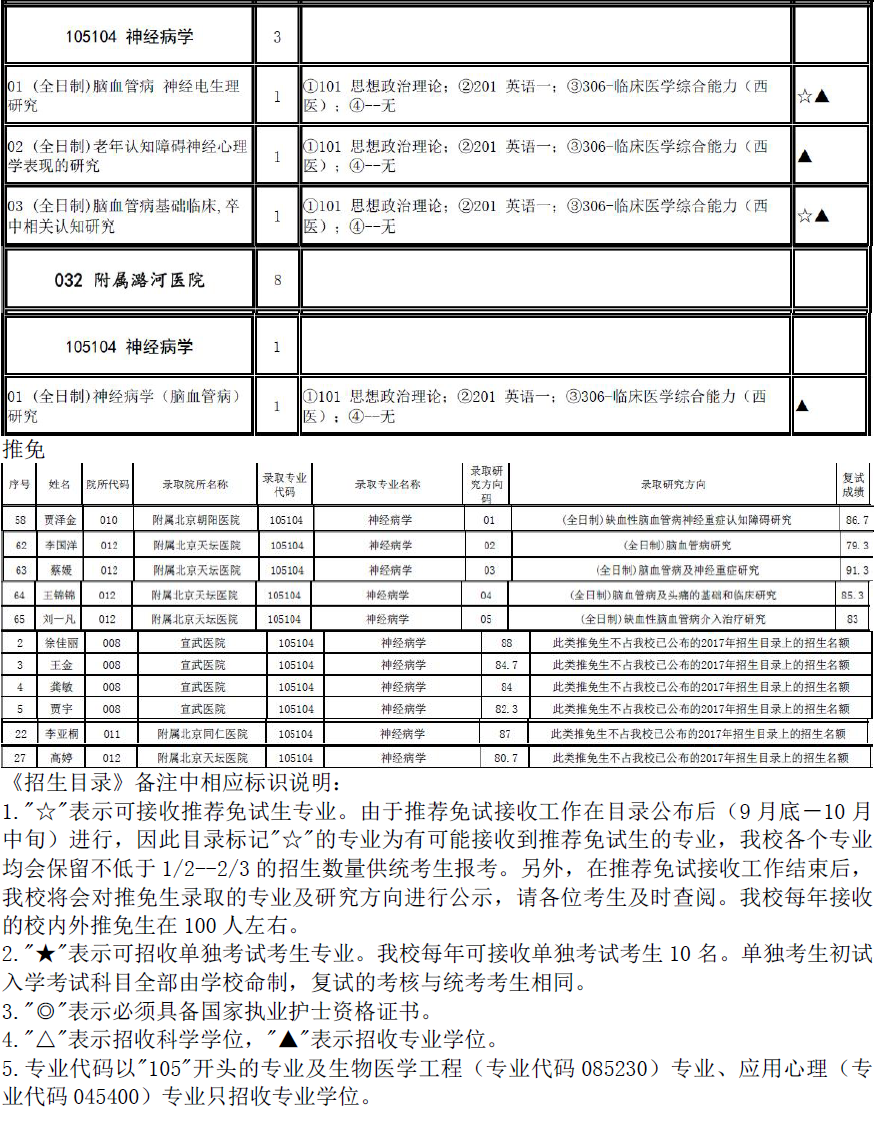 2017年首都医科大学105104神经病学招生目录、推免名单