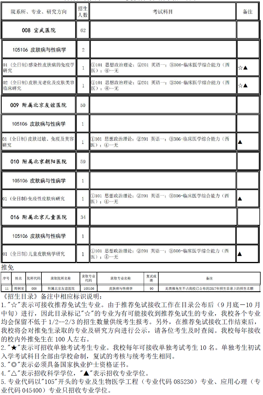 2017年首都医科大学105106皮肤病与性病学招生目录、推免名单