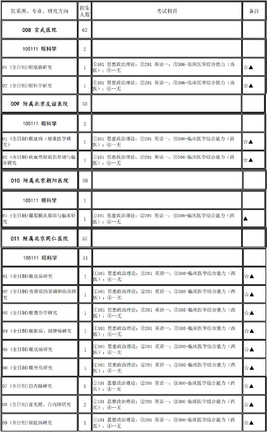 2017年首都医科大学105111眼科学招生目录、推免名单