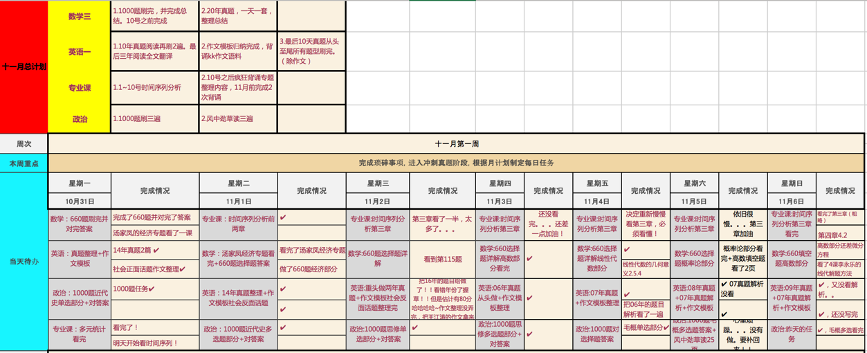 时间管理的好坏可以说是决定考研成败的最主要因素了。你整个考研历程是一路顺风,还是跌跌撞撞都取决于对时间的把握。这里我不推荐任何复杂的时间管理工具。只需要使用最原始的工具就可以,这就是Excel。