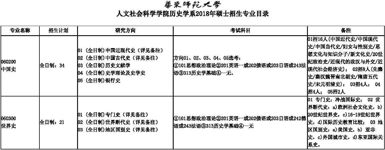 华东师范大学历史系2018年硕士研究生招生人数、招生专业