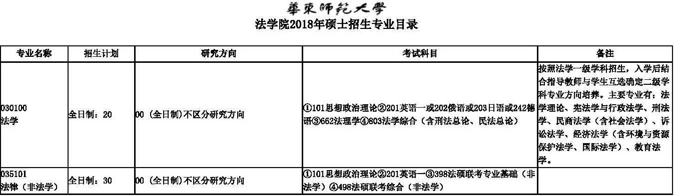 华东师范大学法学院2018年硕士研究生招生人数、招生目录