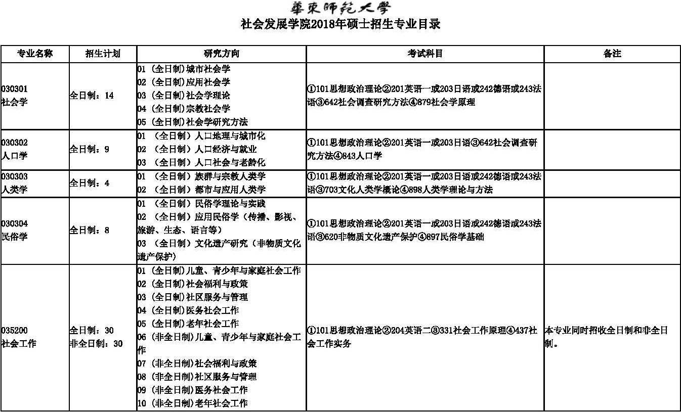 华东师范大学社会发展学院2018年硕士研究生招生人数、招生专业