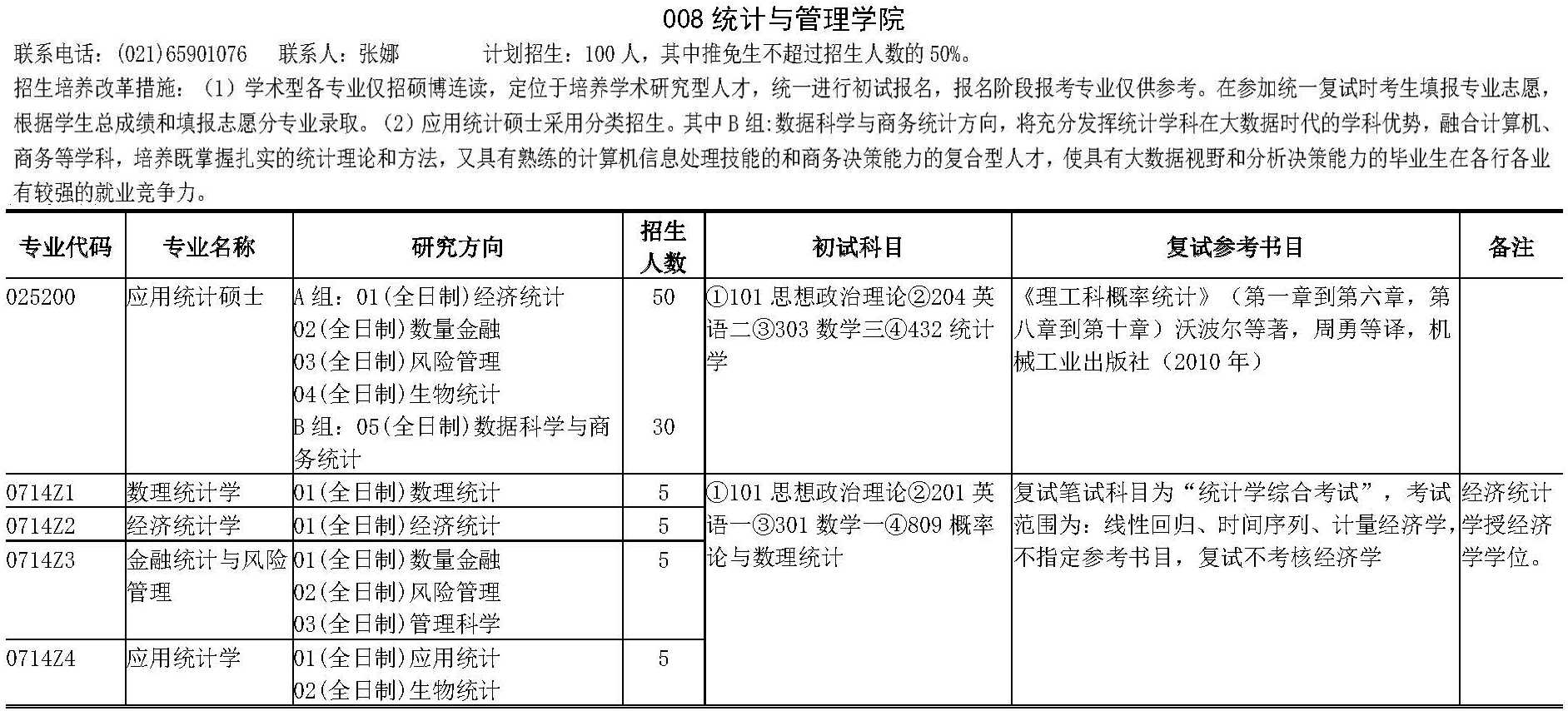 上海财经大学统计与管理学院2018年硕士研究生招生专业、招生人数
