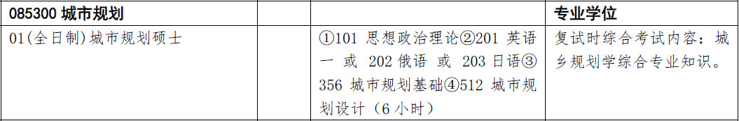 ①101 思想政治理论②201 英语一 或 202 俄语 或 203 日语③356 城市规划基础④512 城市规划设计(6 小时)