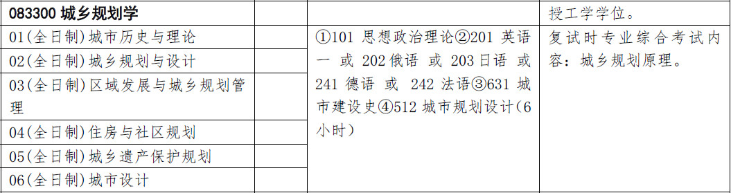 ①101 思想政治理论②201 英语一 或 202 俄语 或 203 日语 或241 德语 或 242 法语③631 城市建设史④512 城市规划设计(6小时)