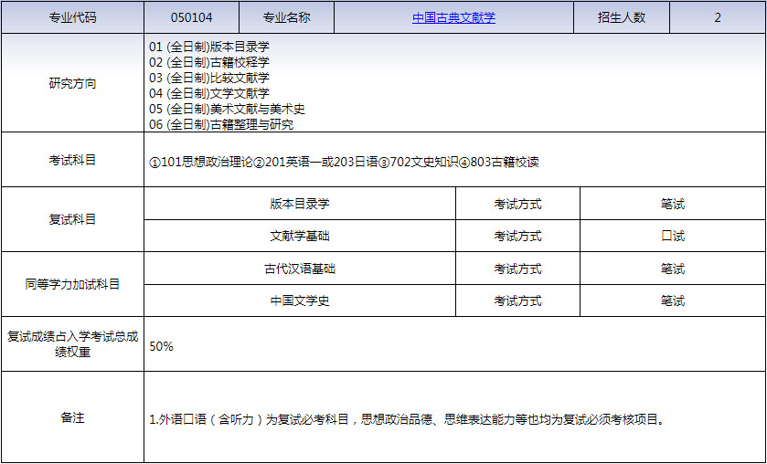 ①101思想政治理论②201英语一或203日语③702文史知识④803古籍校读