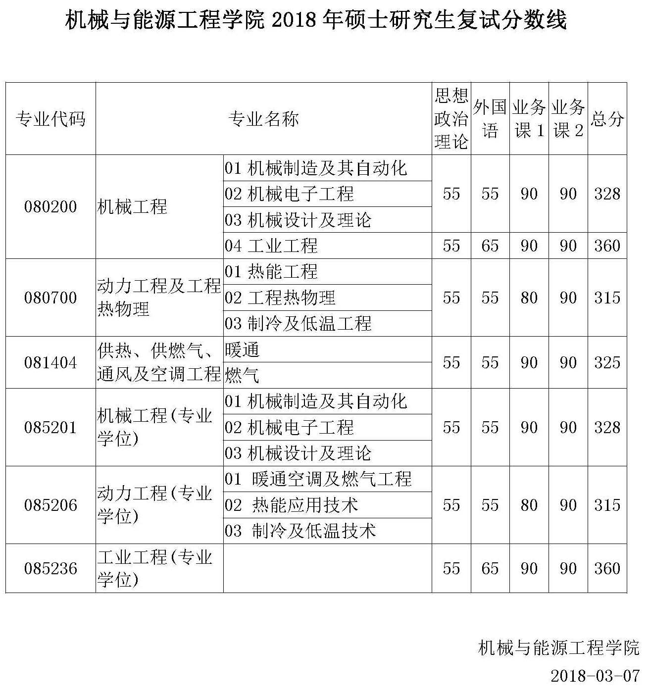 同济大学机械与能源工程学院2018年硕士研究生复试分数线