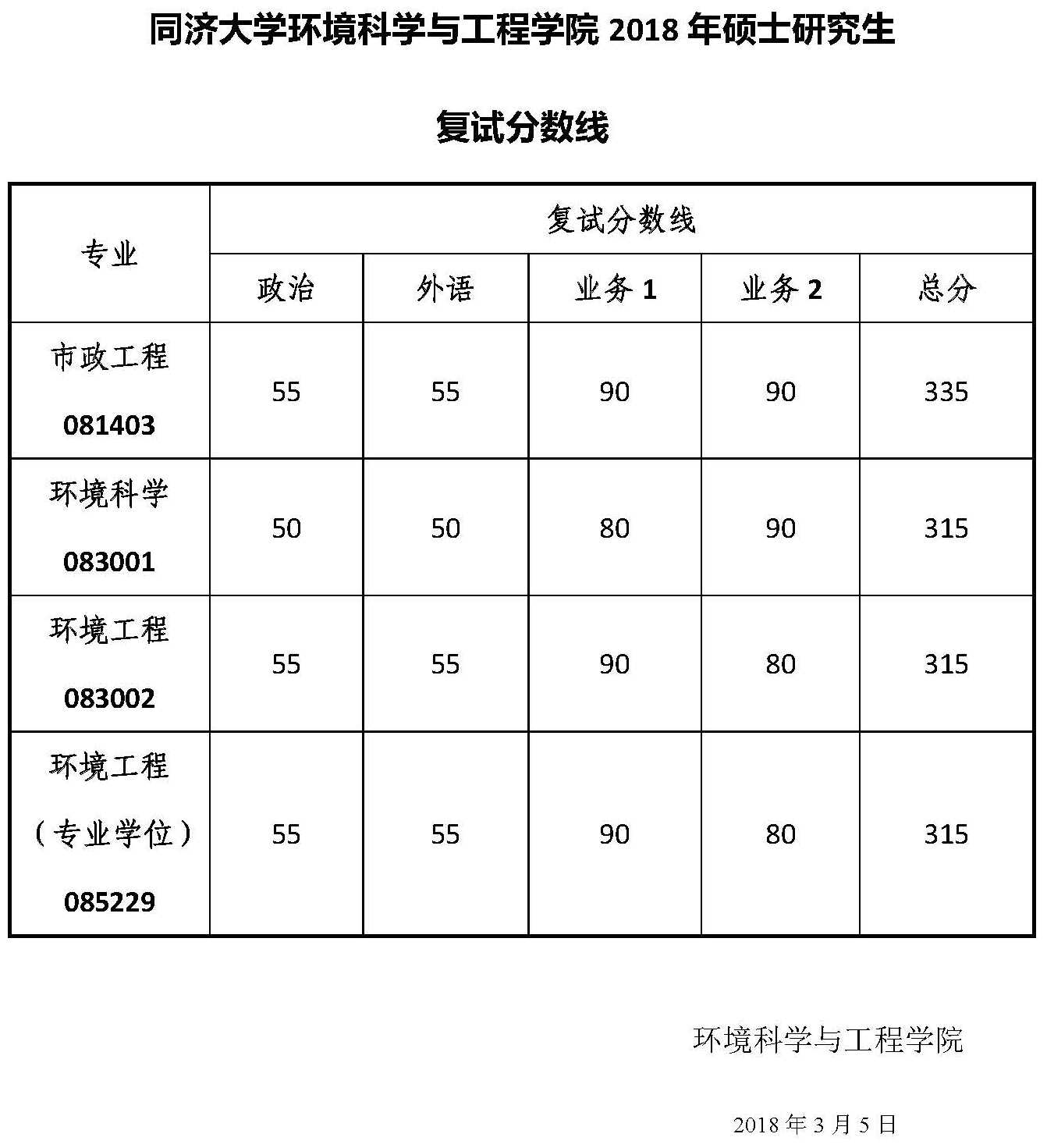 同济大学环境科学与工程学院2018年硕士研究生复试分数线