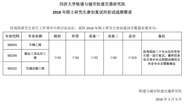 同济大学铁道与城市轨道交通研究院2018年硕士研究生复试分数线