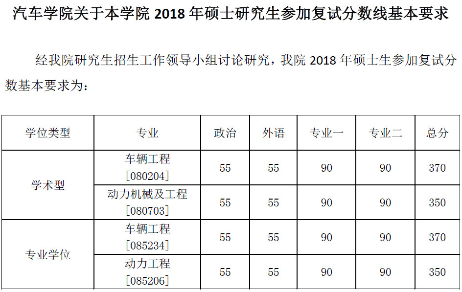 同济大学汽车学院2018年硕士研究生复试分数线