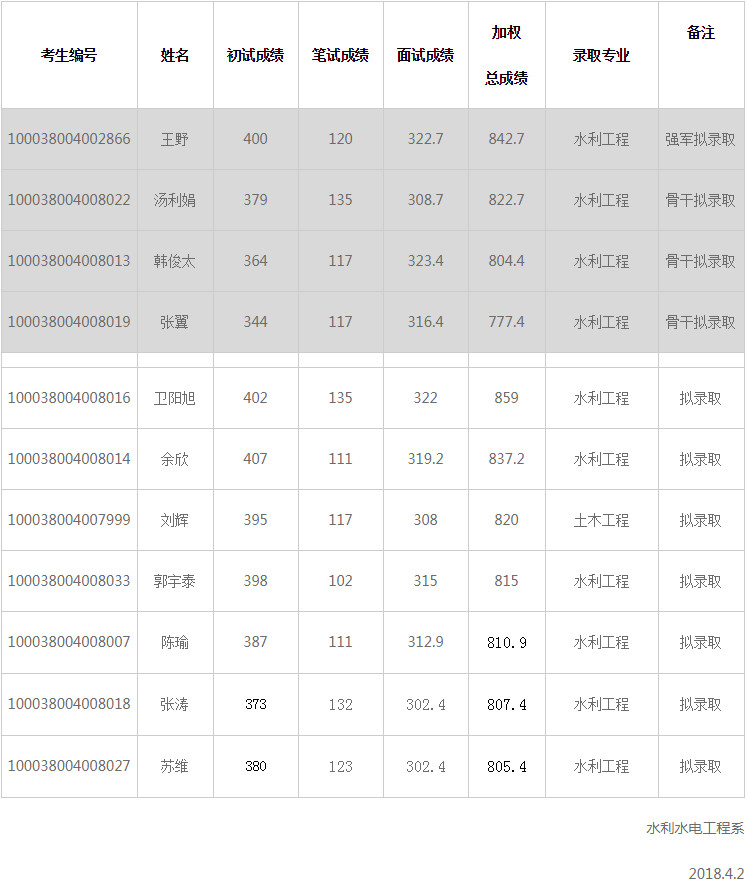 清华大学水利水电系2018年硕士研究生拟录取名单