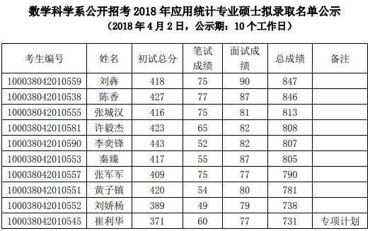 清华大学数学科学系2018年硕士研究生拟录取名单