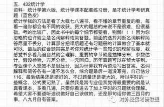 在具体章节上看,统计学1-6章可以算作描述性统计,7-14章可以算作统计推断。显然,后者是重点,多考大题。前者是基础,相对多考小题和细节题。大题复习上,建议大家以参数估计、假设检验、一元回归、多元回归和指数为重点。复习的方式应该是主要把课后题刷完,并且对着相关参考答案(也是人大出版社,贾老师主编)配套用书对着答案对一遍。要求是,在考前达到熟练得得心应手的境界:一看就会,一做就对!在小题的复习上,建议大家更注意理解统计学本身的内容,推导为辅,应用为主,以第1到第6章为主。此外,在随机变量的数值特征部分,会涉及相关计算,比如计算期望和方差。此条跟396的考点中的数学部分是有重复的,建议大家在备考过程中把432和396这部分结合起来,相互促进。