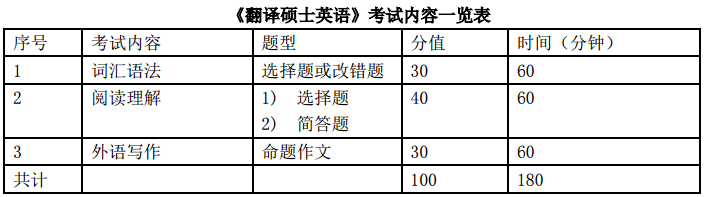 本考试是一种测试应试者单项和综合语言能力的尺度参照性水平考试。考试范围包括MTI考生入学应具备的英语词汇量、英语语法知识以及英语阅读与写作等方面的技能。