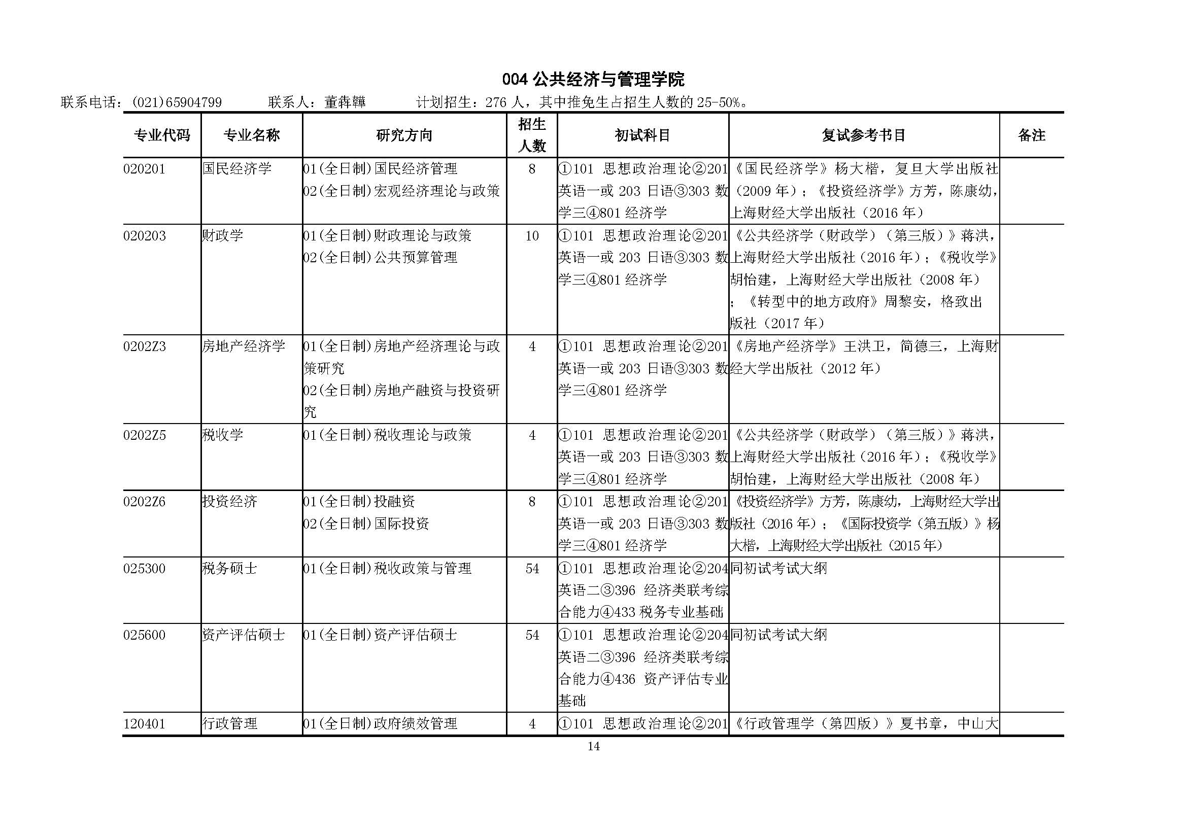 上海财经大学2019年公共经济与管理学院硕士研究生招生专业目录、招生人数