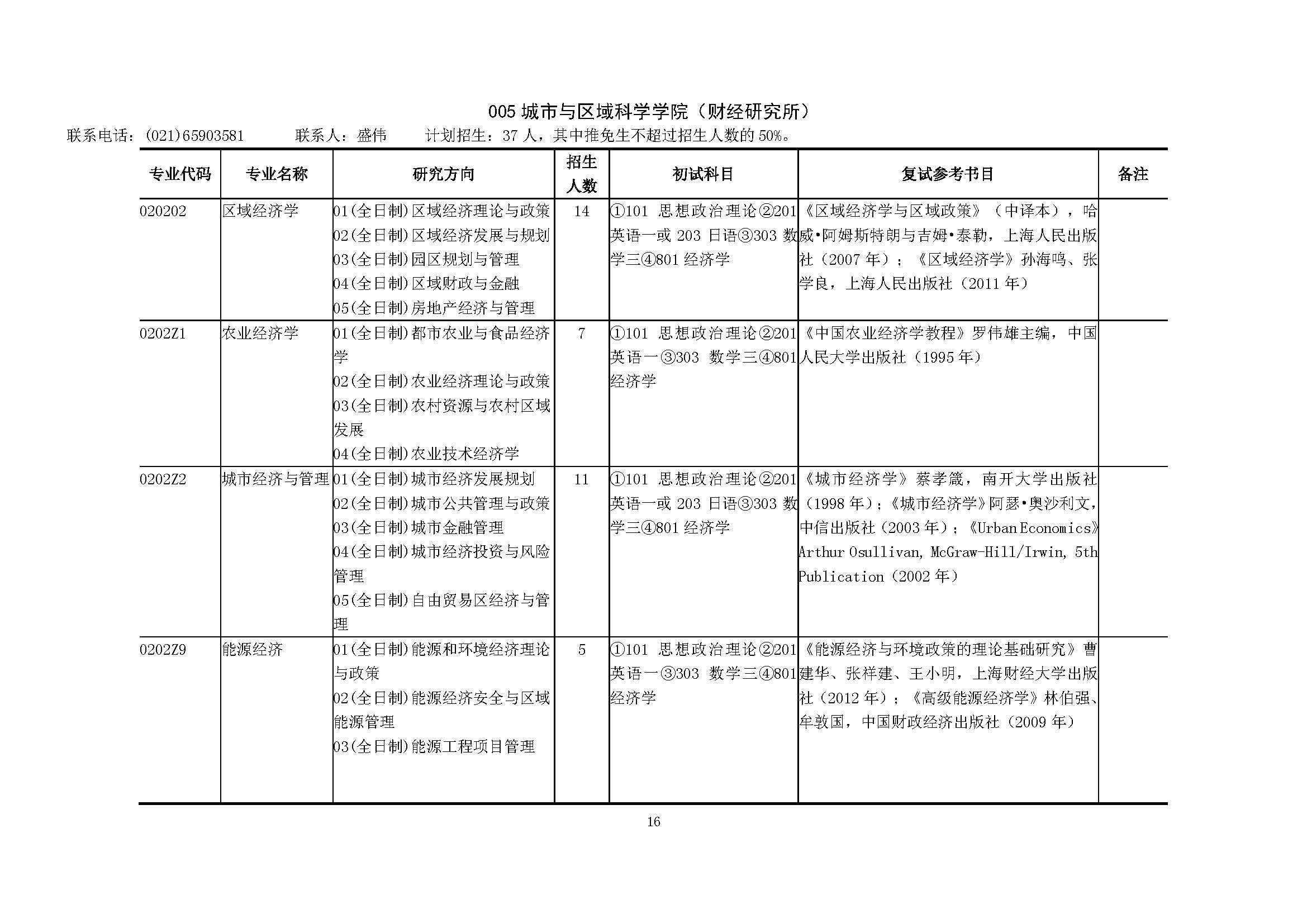 上海财经大学2019年城市与区域科学学院硕士研究生招生专业目录、招生人数