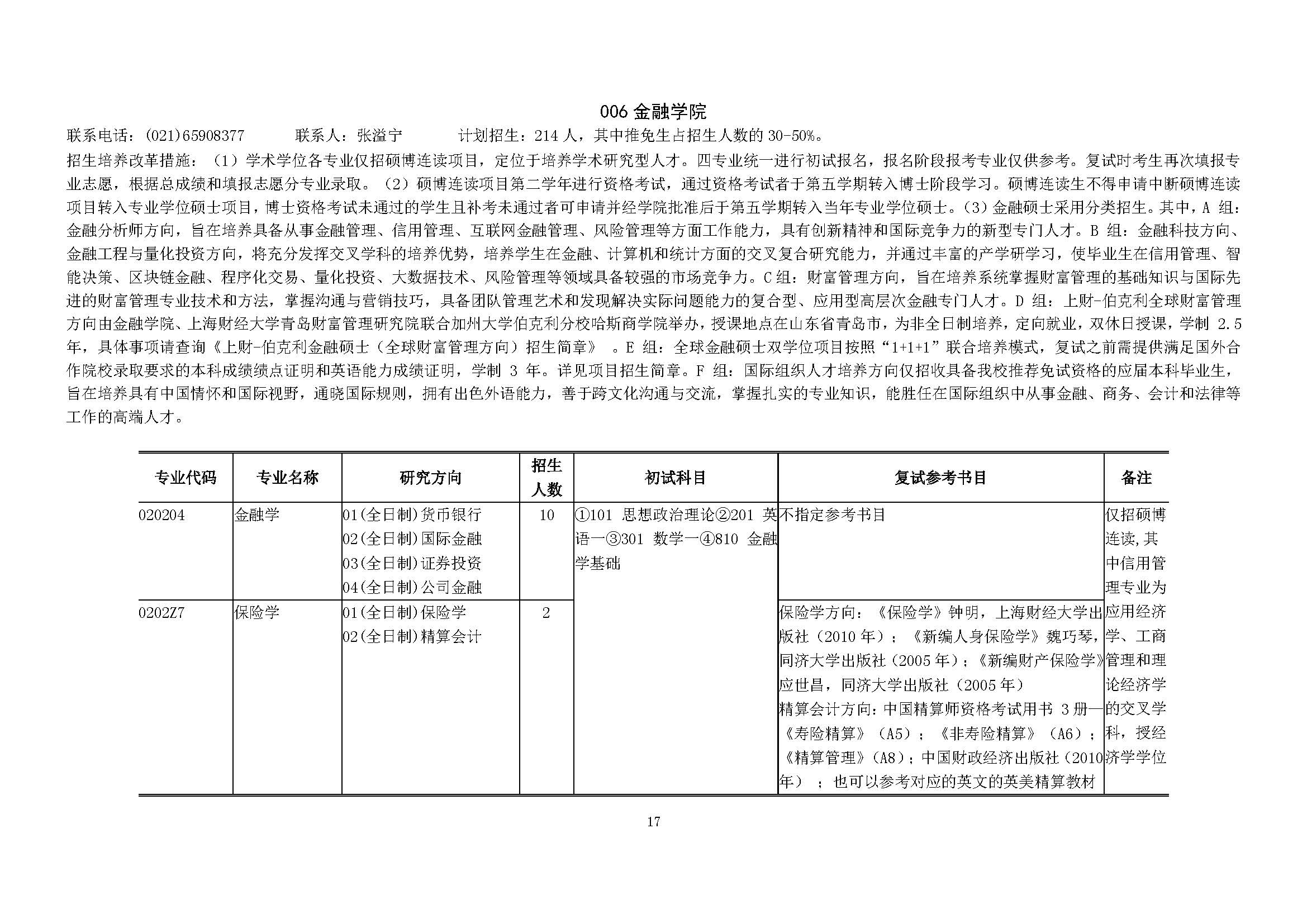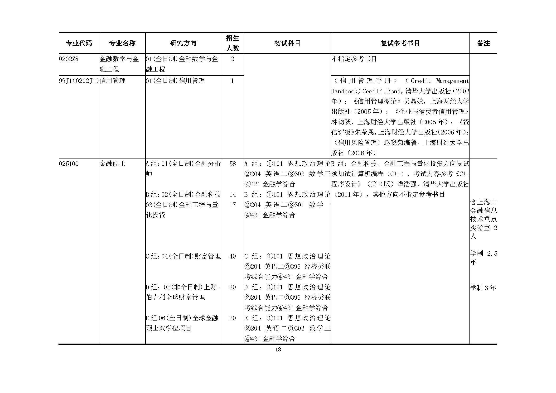上海财经大学2019年金融学院硕士研究生招生专业目录、招生人数