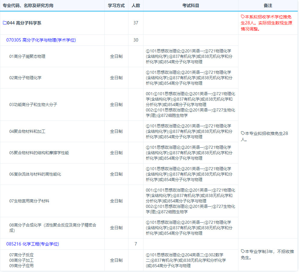 2019年复旦大学高分子科学系考研招生专业、招生人数、考试科目