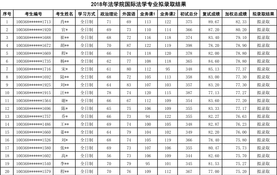 五、对外经济贸易大学国际法学专业研究生拟录取情况(2018年名单):