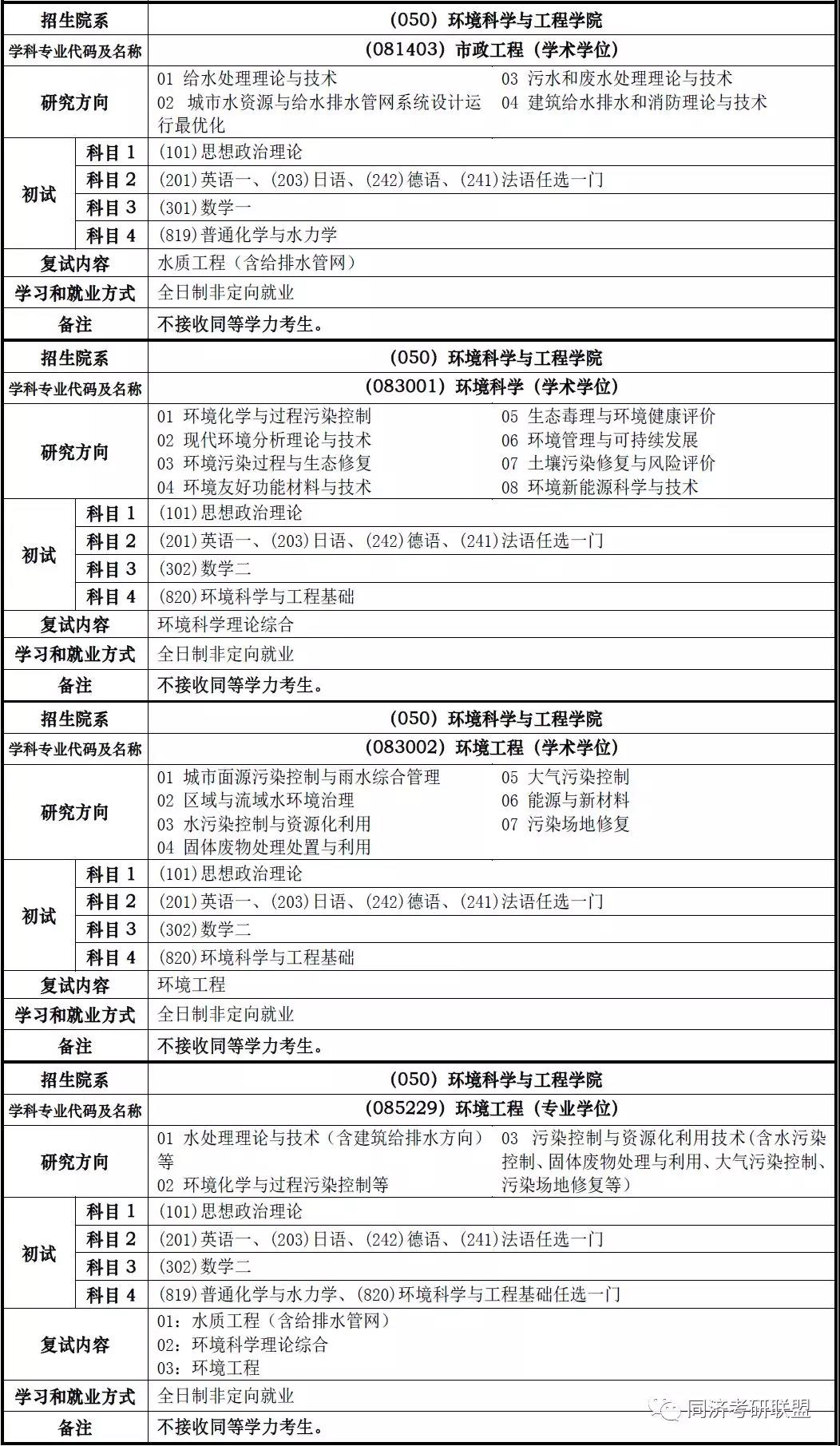 2019年同济大学环境科学与工程学院考研招生专业、考试科目