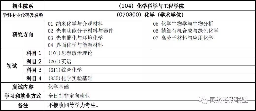 2019年同济大学化学科学与工程学院考研招生专业、考试科目
