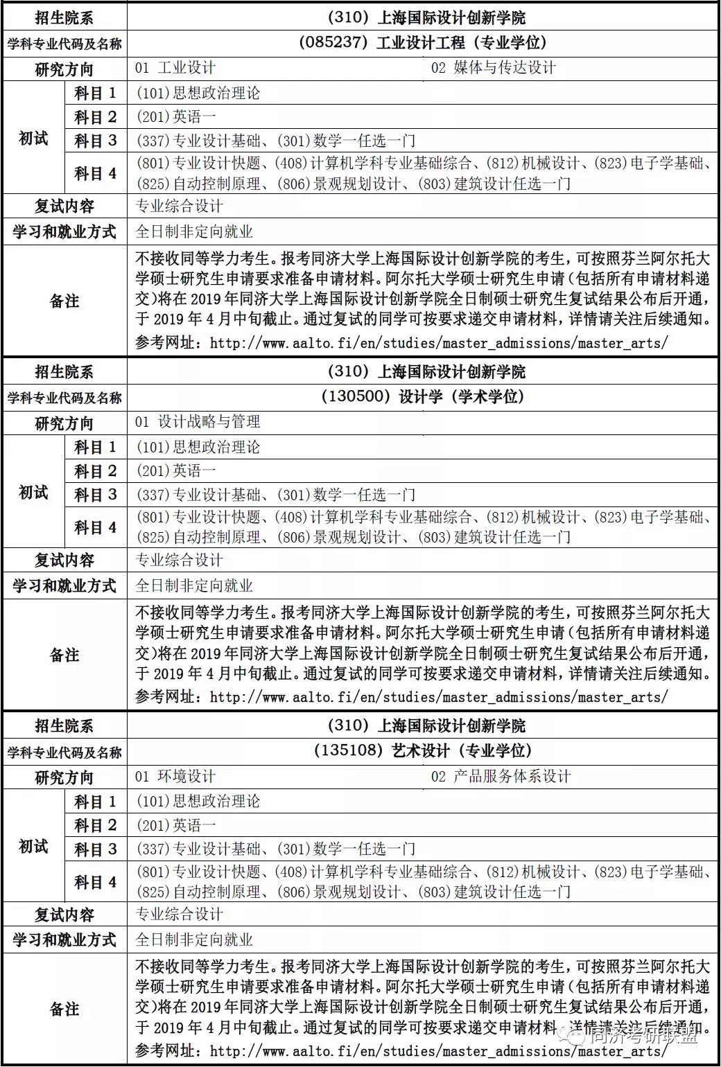2019年同济大学上海国际设计创新学院考研招生专业、考试科目