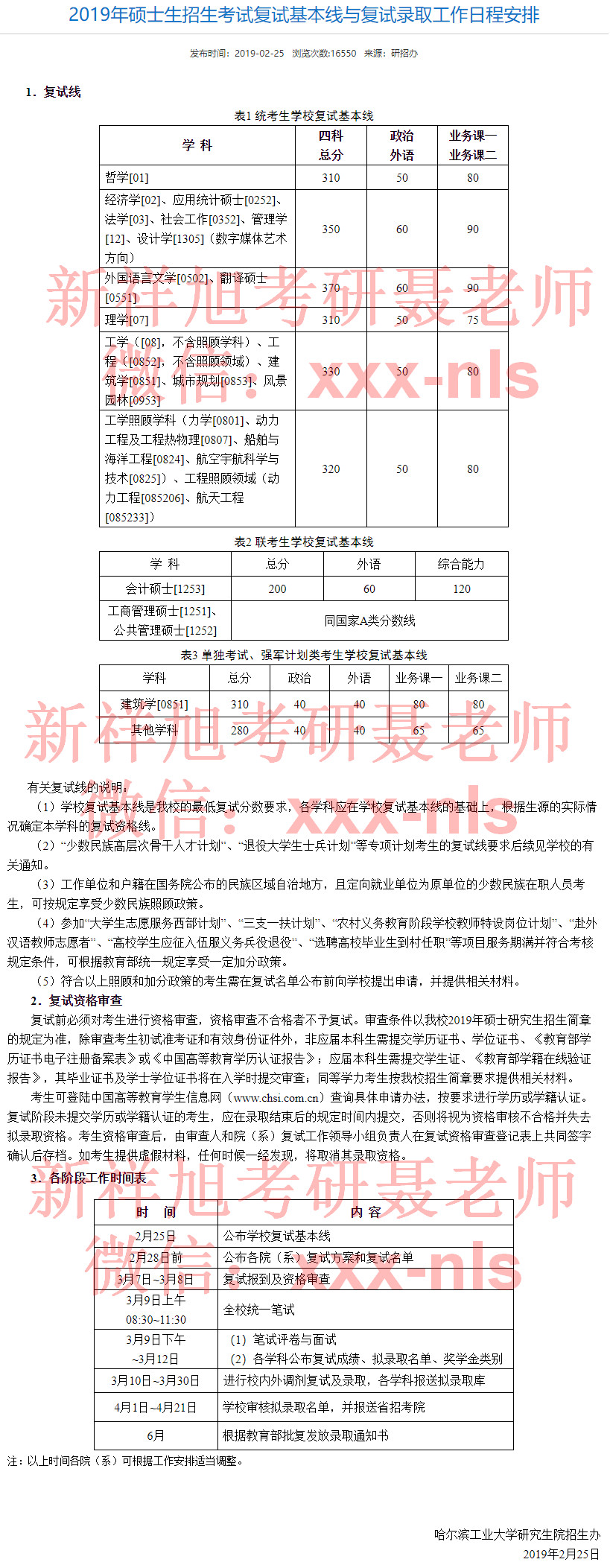 哈尔滨工业大学2019年硕士生招生考试复试基本线与复试录取工作日程安排