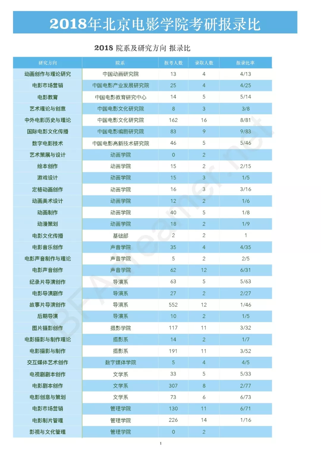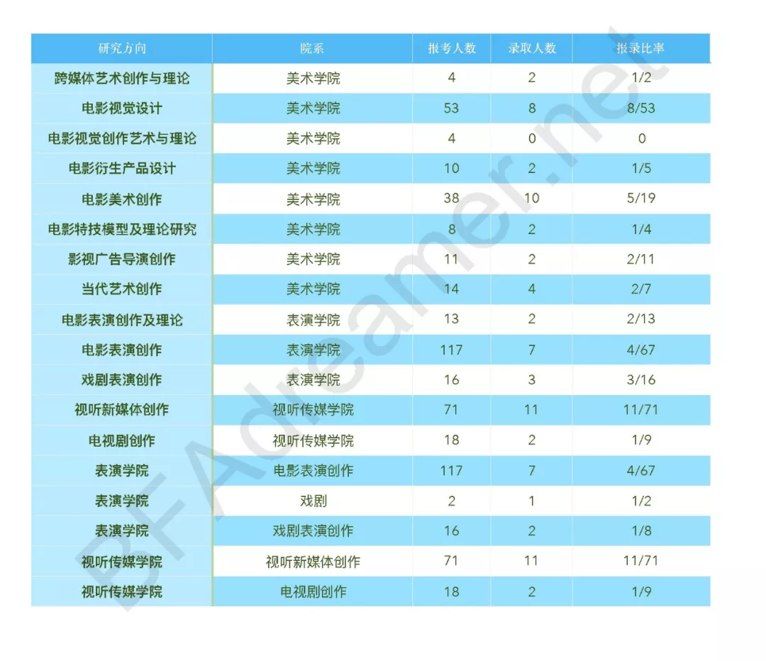 下图为2018北京电影学院考研各个院系、各个研究方向的报名人数、录取人数和最后的报录比,给大家选报专业的时候进行参考。