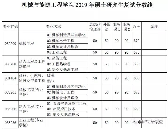 同济大学机械与能源工程学院2019年复试分数线