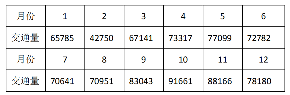 1、某测站测得 2015 年各月的交通量及全年的累积交通量如下表,试计算该年第一季度各月的月平均日交通量(MADT)与月变系数(K月)。(10 分)