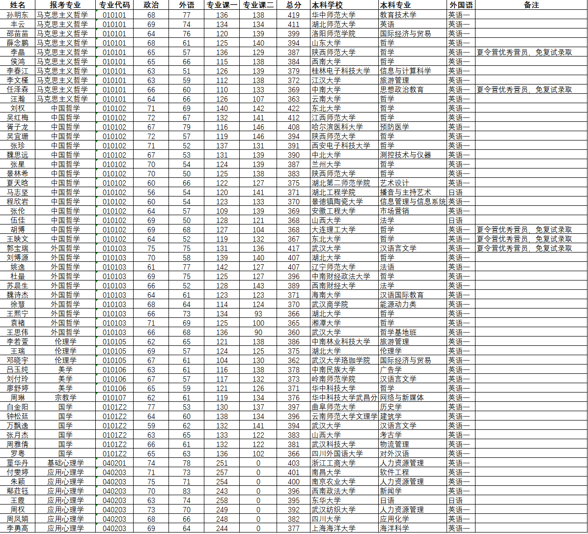 各专业上线考生人数:马克思主义哲学10人(含2名优秀营员)、中国哲学15人(含2名优秀营员)、外国哲学10人(含1名优秀营员)、伦理学3人、美学3人、宗教学1人、国学6人,逻辑学和科学技术哲学无上线考生;基础心理学1人,应用心理学7人。