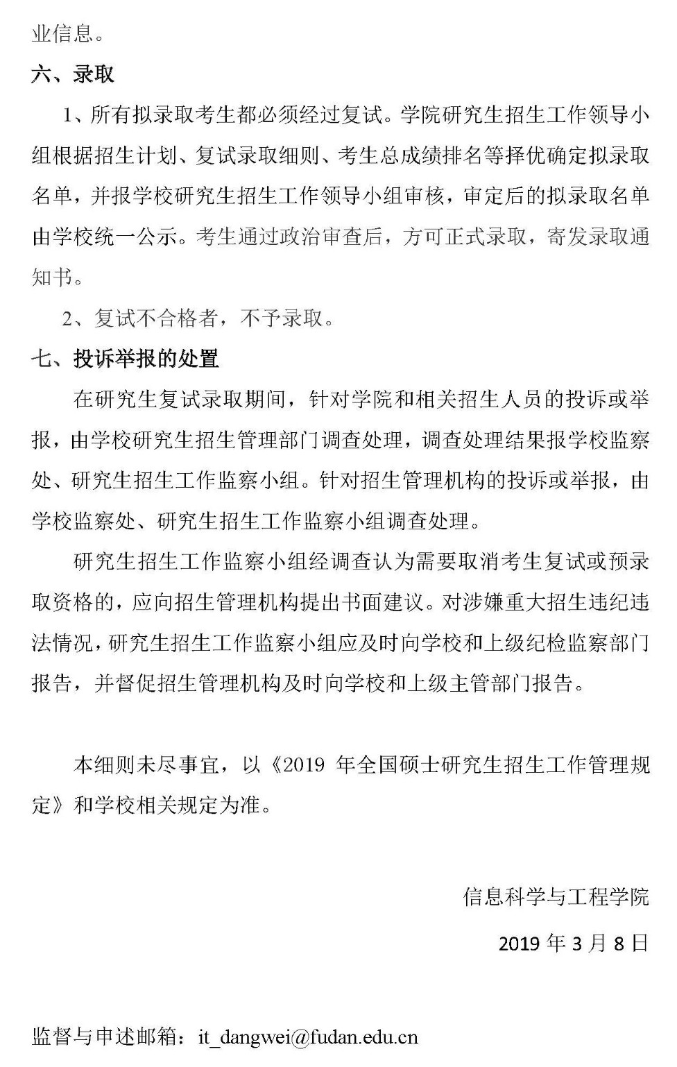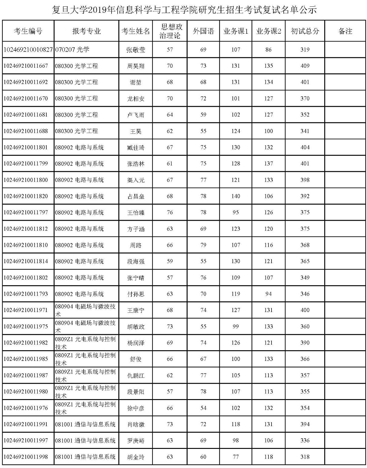 复旦大学信息科学与工程学院2019年复试名单及复试细则