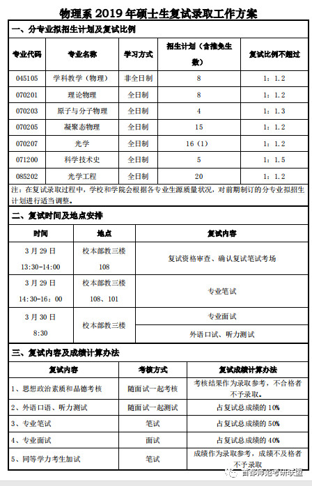 2019年首师大物理系学院硕士研究生复试录取工作方案