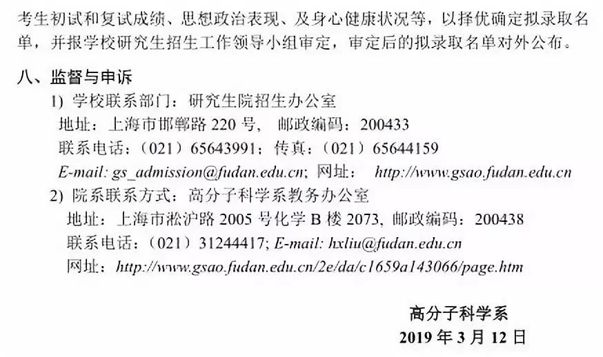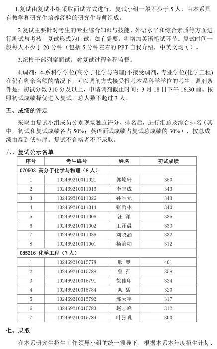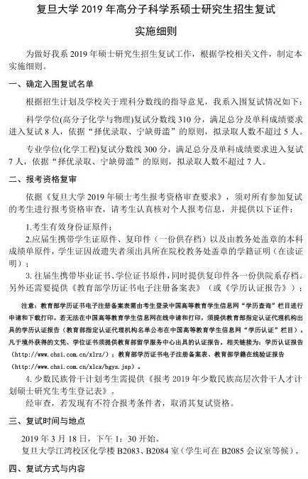 复旦大学高分子科学系2019年复试名单及复试细则