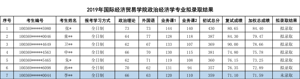 2019年对外经济贸易大学政治经济学专业硕士研究生拟录取名单
