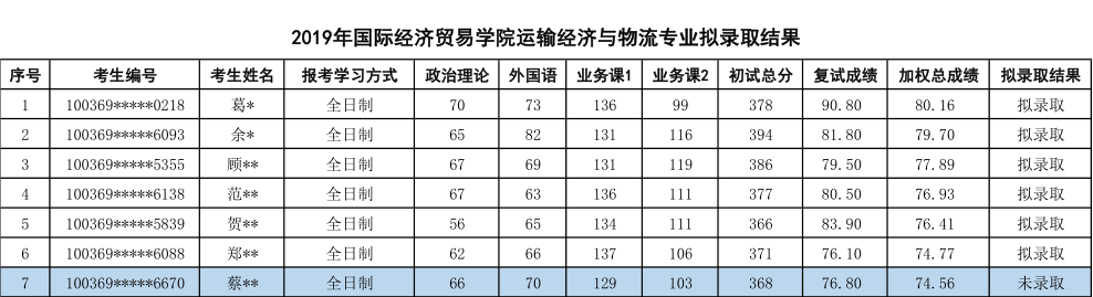 2019年对外经济贸易大学运输经济与物流专业硕士研究生拟录取名单