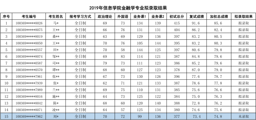 2019年对外经济贸易大学金融学(信息学院)专业硕士研究生拟录取名单